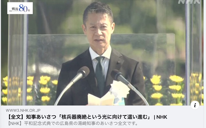 ・法と外交を基軸とする国際秩序は様変わりし、剥き出しの暴力が支配する世界へと変わりつつあり、私達は今、この繁栄が如何に脆弱なものであるかを痛感しています。 ・歴史が証明するように、ペロポネソス戦争以来古代ギリシャの昔から、力の均衡による抑止は繰り返し破られてきました。なぜなら、抑止とは、あくまで頭の中で構成された概念又は心理、つまりフィクションであり、万有引力の法則のような普遍の物理的真理ではないからです。 ・自信過剰な指導者の出現、突出したエゴ、高揚した民衆の圧力。あるいは誤解や錯誤により抑止は破られてきました。我が国も、力の均衡では圧倒的に不利と知りながらも、自ら太平洋戦争の端緒を切ったように、人間は必ずしも抑止論、特に核抑止論が前提とする合理的判断が常に働くとは限らないことを、身を以て示しています。 ・実際、核抑止も80年間無事に守られたわけではなく、核兵器使用手続の意図的な逸脱や核ミサイル発射拒否などにより、破綻寸前だった事例も歴史に記録されています。 →米軍統治下時代に核ミサイル「ナイキ・ハーキュリーズ」が配備されていた米軍那覇サイト(那覇空港)で、1959年6月19日、核弾頭を搭載したミサイルが誤って発射されていた、など。 →キューバ ミサイル危機が絶頂に登り詰めていた1962年10月、通信が途切れ自分たちが攻撃されていると信じたソ連潜水艦のある司令官は核弾頭の発射を命令したが、副司令官の説得によって発射をあきらめた。 →1983年9月26日の深夜、米国から1発のミサイルが発射されたという警報が発令されが、それを誤報と判断し、核戦争から世界を救ったとされるソ連核ミサイル発射警告衛星ネットワーク「オコ」(Oko、ロシア語で「目」)を担当する当直将校スタニスラフ・ペトロフ。 ・国守りて山河なし。もし核による抑止が、歴史が証明するようにいつか破られて核戦争になれば、人類も地球も再生不能な惨禍に見舞われます。概念としての国家は守るが、国土も国民も復興不能な結末が有りうる安全保障に、どんな意味あるのでしょう。 ・抑止力とは、武力の均衡のみを指すものではなく、ソフトパワーや外交を含む広い概念であるはずです。そして、仮に破れても人類が存続可能になるよう、抑止力から核という要素を取り除かなければなりません。 ・核抑止の維持に年間14兆円超が投入されていると言われていますが、その十分の一でも、核のない新たな安全保障のあり方を構築するために頭脳と資源を集中することこそが、今我々が力を入れるべきことです。 ・核兵器廃絶は決して遠くに見上げる北極星ではありません。被爆で崩壊した瓦礫に挟まれ身動きの取れなくなった被爆者が、暗闇の中、一筋の光に向かって一歩ずつ這い進み、最後は抜け出して生を掴んだように、実現しなければ死も意味し得る、現実的・具体的目標です。 ・“諦めるな。押し続けろ。進み続けろ。光が見えるだろう。そこに向かって這っていけ。”(2017年12月10日ノーベル平和賞授賞式でのサーロー節子氏のスピーチ) ・這い出せず、あるいは苦痛の中で命を奪われた数多くの原爆犠牲者の無念を晴らすためにも、我々も決して諦めず、粘り強く、核兵器廃絶という光に向けて這い進み、人類の、地球の生と安全を勝ち取ろうではありませんか。 (2025年8月6日平和記念式典での広島県の湯崎知事のあいさつ) 米国による広島原爆投下から80年のこの日、実に明快に、「核抑止論」なるものの虚妄を指摘する広島県知事のことば。 米国は今も5000 発の核兵器を保有し、NPT核拡散防止条約が課す核保有国の核兵器削減にはなんら意志を示さない。それどころかNPT非加盟のイスラエルの核保有は容認し、国連安保理会合さえ欠席して、イスラエルによるパレスチナの人々へのジェノサイドにも加担する。 核の脅しとともに隣国を侵略するロシアもそれを容認する中国も、核の削減には背を向ける。これらの国の政治指導者と軍当事者らが、理性的・合理的そして倫理的な判断が可能な人物であるか、全く疑わしいという現在の世界そして人類の危機。 様々な偶発事案を見れば、80年もの間人類が核戦争を回避できたのは、被爆者と世界の人々の弛まぬ努力とともに、全くの偶然、奇跡でしかない。軍備管理・軍縮とりわけ核兵器削減と全面禁止にしか、人類の未来はない。 《被爆80年目の8月6日を迎えるにあたり、原爆犠牲者の御霊に、広島県民を代表して謹んで哀悼の誠を捧げます。そして、今なお苦しみの絶えない被爆者や御遺族の皆様に、心からお見舞いを申し上げます。 草木も生えぬと言われた75年からはや5年、被爆から3代目の駅の開業など広島の街は大きく変わり、世界から観光客が押し寄せ、平和と繁栄を謳歌しています。しかし同時に、法と外交を基軸とする国際秩序は様変わりし、剥き出しの暴力が支配する世界へと変わりつつあり、私達は今、この繁栄が如何に脆弱なものであるかを痛感しています。 こ