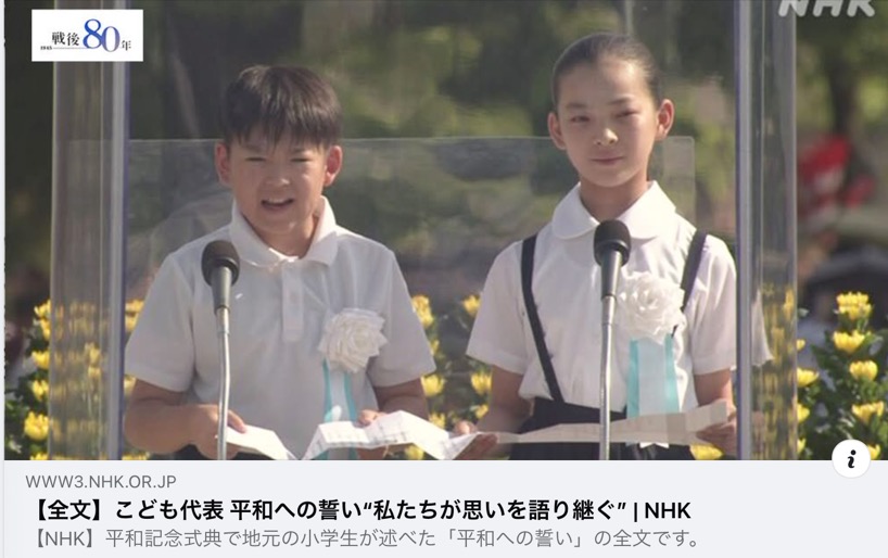 | 2025年 8月 6日 被爆から80年が経つ今、本当は辛くて、思い出したくない記憶を伝えてくださる被爆者の方々から、直接話を聞く機会は少なくなっています。 どんなに時が流れても、あの悲劇を風化させず、記録として被爆者の声を次の世代へ語り継いでいく使命が、私たちにはあります。 世界では、今もどこかで戦争が起きています。 大切な人を失い、生きることに絶望している人々がたくさんいます。 その事実を自分のこととして考え、平和について関心をもつこと。 多様性を認め、相手のことを理解しようとすること。 一人一人が相手の考えに寄り添い、思いやりの心で話し合うことができれば、傷つき、悲しい思いをする人がいなくなるはずです。 周りの人たちのために、ほんの少し行動することが、いずれ世界の平和につながるのではないでしょうか。ーー 原爆投下80年の広島平和記念式典のこども代表「平和への誓い」から。この子たちがこの国の首相、米国の大統領だったら、世界はどれほど平和で穏やかだろうか。 「大人になる」とは、錯誤や偏見、妄想、他者への蔑視、自慢・自己中に塗れたカルト信者や独裁者になることではないはずだが、残念ながらこの国も世界もそういう輩が幅を利かせている。 少年少女たちに教えられる8月6日。 《平和への誓い いつかはおとずれる、被爆者のいない世界。 同じ過ちを繰り返さないために、多くの人が事実を知る必要があります。 原子爆弾が投下されたあの日のことを、思い浮かべたことはありますか。 昭和20年(1945年)8月6日 午前8時15分。 この広島に人類初の原子爆弾が投下され、一瞬にして当たり前の日常が消えました。 誰なのか分からないくらい皮膚がただれた人々。 涙とともに止まらない、絶望の声。 一発の原子爆弾は、多くの命を奪い、人々の人生を変えたのです。 被爆から80年が経つ今、本当は辛くて、思い出したくない記憶を伝えてくださる被爆者の方々から、直接話を聞く機会は少なくなっています。 どんなに時が流れても、あの悲劇を風化させず、記録として被爆者の声を次の世代へ語り継いでいく使命が、私たちにはあります。 世界では、今もどこかで戦争が起きています。 大切な人を失い、生きることに絶望している人々がたくさんいます。 その事実を自分のこととして考え、平和について関心をもつこと。 多様性を認め、相手のことを理解しようとすること。 一人一人が相手の考えに寄り添い、思いやりの心で話し合うことができれば、傷つき、悲しい思いをする人がいなくなるはずです。 周りの人たちのために、ほんの少し行動することが、いずれ世界の平和につながるのではないでしょうか。 One voice. たとえ一つの声でも、学んだ事実に思いを込めて伝えれば、変化をもたらすことができるはずです。 大人だけでなく、こどもである私たちも平和のために行動することができます。 あの日の出来事を、ヒロシマの歴史を、二度と繰り返さないために、私たちが、被爆者の方々の思いを語り継ぎ、一人一人の声を紡ぎながら、平和を創り上げていきます。 |
