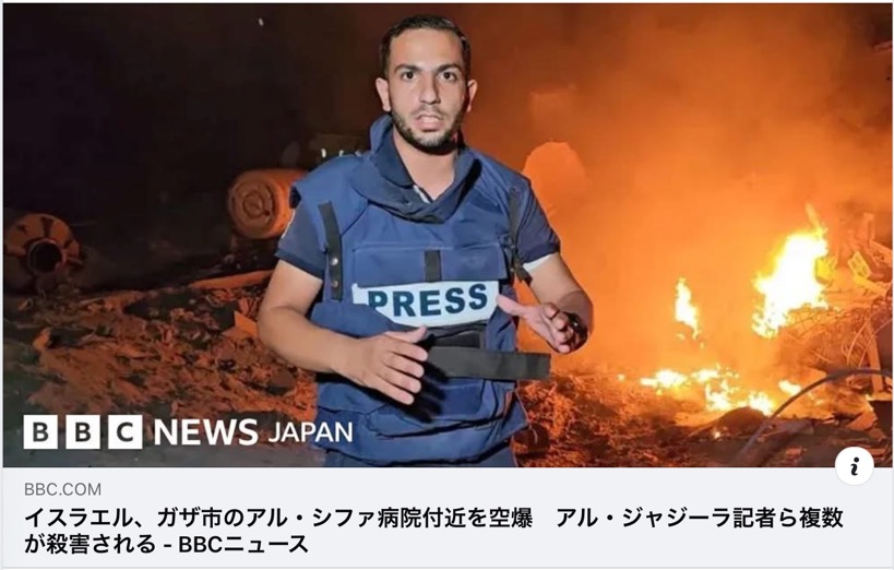 10日イスラエルはガザ市のアル・シファ病院正門前の報道用テントを攻撃し、アルジャジーラの記者、カメラマンら5人を殺害。BBCは、国連高等弁務官事務所がこれを「イスラエルの重大な国際人道法違反」とし、殺害されたアナス・アル・シャリフ記者は、戦争前にハマスのメディア部門で働いていたと理解している。シャリフ記者はイスラエルが海外ジャーナリストを排除したガザに開かれた窓だったと伝える。彼を戦闘員とするイスラエルが提示したものは単なる紙切れに過ぎず、ジャーナリスト保護委員会は証拠を提出していないと非難。