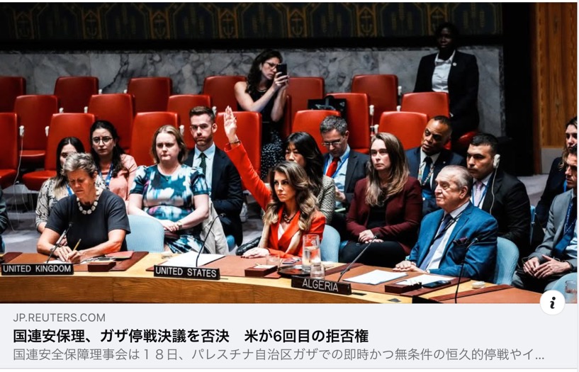 ・18日国連安全保障理事会で非常任理事国10カ国が提案し、14カ国が賛成した、ガザでの即時・無条件の恒久停戦とイスラエルによる支援物資搬入の制限解除を求める決議案を、米国が6回目の拒否権行使によって否決。 ・決議案は、すべての当事者による無条件、かつ恒久的な停戦合意、ハマスやその他のグループが拘束しているすべての人質の即時かつ無条件の解放、ガザにおける必要不可欠なサービスの回復と、人道援助の入国と配布に対するイスラエルのすべての制限の解除を求めるもの。 ・8月18日、イスラム組織ハマスはガザ地区での60日間の停戦と人質解放をめぐって、仲介国から提示されていたイスラエルとの合意案に同意したと報じられる。 ・9月7日ハマスが受け取ったアメリカ案は、60日間の停戦の最初の48時間で人質全員を解放し、イスラエルで収監されているパレスチナ人も解放し、恒久停戦に関して誠実に交渉を行う、というもの。トランプは、イスラエルが自分の条件を受け入れたと述べたが、イスラエル軍は飢餓に苦しむ約100万人の市民らに、直ちに避難するよう警告。 「この2日間でテロリストの高層ビルを50棟倒したが、これはガザ市での地上作戦の始まりに過ぎない。ガザ市の住民に告げる。皆さんにはすでに警告している。そこから出ろ」ネタニヤフ 「人質を解放し、武器を置け。さもなければ、ガザは破壊され、お前たちは全滅する」国防相カッツ ネタニヤフらが行なっていることは停戦交渉ではなく、停戦案を振りかざした本音は、ガザの完全制圧とハマス壊滅に向けた戦闘とジェノサイドの拡大。 それを安保理常任理事国の一つアメリカが、イスラエルの戦争の支援者として停戦案を6回目の拒否権行使で葬り去る。まさにジェノサイド条約が規定する集団殺害の共犯者がトランプの米国。 ガザはさらに破壊され尽くし、市民は殺傷され飢餓に苦しみ続ける。人質の命も同様。ネタニヤフもトランプも、そしてこの安保理米国代表らも、ガザ市民や人質の生命などどうでもいいということ。米国は世界の不成者となった。いずれ歴史の厳正な審判が降る。 《国連安全保障理事会は18日、パレスチナ自治区ガザでの即時かつ無条件の恒久的停戦やイスラエルによる支援物資搬入の制限解除を求める決議案を否決した。理事国15カ国のうち14カ国が賛成したが、常任理事国の米国が拒否権を行使した。 約2年におよぶイスラエルとイスラム組織ハマスの戦闘を巡り米国が拒否権を行使するのは6回目。 決議案はハマスなどが拘束している人質全員の即時かつ無条件の解放も要求していた。 デンマークの代表は採決前に「ガザでは飢餓が確認された。予測でも宣言でもない、確認だ」と述べ、「一方でイスラエルはガザ市で軍事作戦を拡大し、民間人の苦しみをさらに深めている。この壊滅的な状況、人道的かつ人間的な失敗が、私たちにきょう、行動を起こさせた」と訴えた。 一方、米国の代表は「ハマスにはこの戦争を開始し継続させている責任がある」とし、「イスラエルは戦争終結につながる条件案を受け入れたが、ハマスはそれを拒否し続けている。ハマスが人質を解放し武器を放棄すれば、この戦争はきょうにも終結が可能だ」と述べた。》 |