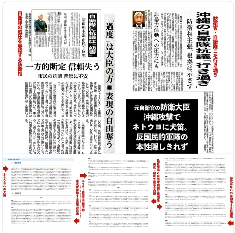 「捨て石の認識ない」などと沖縄戦における住民の多大な犠牲と「集団自決」への軍、政府の責任を認めず、旧日本軍を賛美するネトウヨ並の元自衛官が文民統制のトップというこの国の危機。
