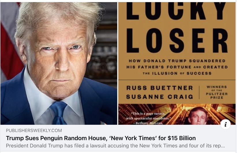 ・9月15日詐病TACOトランプは、昨年大統領選挙中の社説など3つの記事について、ニューヨーク・タイムズ紙とその記者4人を相手取り、150億ドルの名誉毀損訴訟を起こす。二人の記者の著書『ラッキー・ルーザー:ドナルド・トランプはいかにして父親の財産を浪費し、成功という幻想を作り上げてきたのか』(ペンギン・プレス)を出版したペンギン・ランダムハウスも被告に。 「この新聞は我が国史上最悪かつ最も堕落した新聞の一つであり、事実上、極左民主党の『代弁者』となっている。私はこれを史上最大の違法選挙献金と見ている」「タイムズ紙は、皆さんのお気に入りの大統領(私!)、私の家族、ビジネス、アメリカ第一運動、MAGA、そして我が国全体について、何十年にもわたって嘘をつき続けてきた」トランプ9月15日 ・9月19日、トランプが名誉を毀損されたとしてニューヨーク・タイムズ紙などを相手取って起こした損害賠償訴訟で、米フロリダ州の連邦地裁は訴状が冗長で不適切な表現が含まれるなどと指摘し却下。 「訴状とは、表面上はもっともらしい救済を求めるのに十分な事実の主張を、簡潔で分かりやすく述べたものだ」「弁護士は依頼人の主張を弁護する際、ある程度の表現の自由が認められているが、今回の訴訟における訴状はその自由の限界をはるかに超えている」「訴状は、誹謗(ひぼう)中傷や罵詈(ばり)雑言のためのパブリック・フォーラムではない」「相手に対して怒りをぶつけるための保護された場でもない」「(訴状は)退屈で煩雑な、将来起こりうる証拠の収集、偏向した主張のリハーサル、あるいは原告の主張を裏付けるとされる法的根拠の長々とした朗読と説明を行う場として不適切かつ許容されない」スティーブン・メリーデイ連邦地裁判事 「ドナルド・トランプ以上にアメリカ合衆国大統領にふさわしくない候補者を想像するのは難しい。国家の利益を私利私欲よりも優先するよう求める大統領職に、彼は道徳的に不適格であることを証明した。また、知恵、誠実さ、共感、勇気、自制心、謙虚さ、規律といった、まさに彼に最も欠けている資質が求められる役割に、気質的に不適格であることを証明した」2024年NYT社説 ・トランプ大統領の嘘(2017年NYTオピニオン) 「多くのアメリカ国民はトランプ大統領の嘘に慣れきっている。しかし、それが日常的なものになったからといって、国民がそれに麻痺してはならない。そこで私たちは、就任宣誓以来、彼が公の場で語ったほぼすべてのあからさまな嘘をリストアップした。【更新】大統領は依然として嘘をつき続けているため、11月11日までのリストに新たな嘘を追加し、それぞれの事実へのリンクも掲載した。ーーー TACOトランプが150億ドルの賠償を求めてニューヨーク・タイムズと記者4人を提訴したスラップ訴訟は、わずか4日で却下。 ブッシュが任命したフロリダ連邦地裁判事は、トランプが提出した訴状を「誹謗中傷や罵詈雑言」「退屈で煩雑」「偏向した主張のリハーサル」と指摘。 NYTその他のメディアは、トランプの不動産業での失敗、ロシアの大統領選挙介入疑惑、本人の性的暴行での賠償判決、議事堂侵入などでの弾劾、性的暴行犯エプスタインとの関わり、そして「移民がペットを食べている」などのトランプに関わるその嘘や虚偽の数々を検証し報道してきただけ。 「言論の自由の回復と連邦政府による検閲を終結させる大統領令」(1月20日)を出した本人が、自らの嘘、不正を報道するメディアに多額の賠償金を請求して脅迫する愚劣さ。その訴状を一蹴した判事や怯まないメディアと記者そして市民がいることが、ロシア化する米国の希望。 《トランプ大統領、ペンギン・ランダムハウスとニューヨーク・タイムズを150億ドルで提訴 エド・ナウォトカ著|2025年9月16日 ドナルド・トランプ大統領は、フロリダ州でニューヨーク・タイムズとその記者であるスザンヌ・クレイグ、ラス・ビュートナー、ピーター・ベイカー、マイケル・S・シュミットを名誉毀損で訴える訴訟を起こした。ビュートナーとクレイグの報道に基づいた著書『ラッキー・ルーザー:ドナルド・トランプはいかにして父親の財産を浪費し、成功という幻想を作り上げてきたのか』(ペンギン・プレス)を出版したペンギン・ランダムハウスも被告に名を連ねている。トランプ大統領は昨年、この本をめぐってペンギン・ランダムハウスを提訴すると警告していた。 この訴訟は、出版社と記者が2024年の大統領選挙キャンペーンを妨害しようとしたと主張し、最低150億ドルの損害賠償を求めている。 訴状には、「本件訴訟の対象である、2人の記者が執筆した悪意に満ちた中傷的で名誉を棄損する書籍と、虚偽で悪意に満ちた中傷的で名誉を棄損する3つの記事は、いずれも被告らが悪意を持って綿密に作成し、トランプ大統領に最大限のダメージを与えることを企てたもので、アメリカ史上最も重大な大統領選挙の真っ只中に公表されたものである。これは、絶