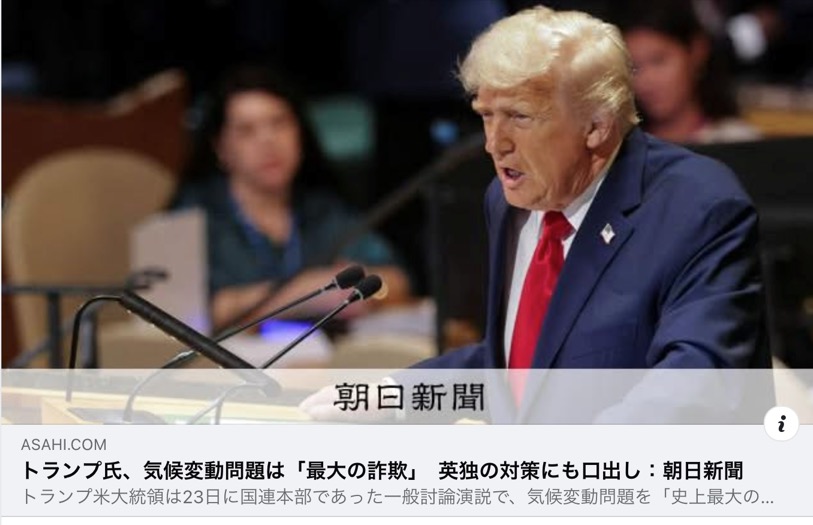「国連から2つのことを受け取った。悪いエスカレーターとテレプロンプターだ」「気温上昇に関する国連などの予測は全て間違っていた。愚かな人間が作った。これは世界が犯した史上最大の詐欺だ」「このグリーン詐欺から脱却しなければ、あなたたちの国は失敗する」「私は物事を予測するのが本当に得意だ」「あたかも紛争継続を促すかのように、パレスチナ国家を一方的に承認しようとする向きがある。(パレスチナ国家承認はイスラム組織ハマスに対する)あまりにも大きい報酬だ」TACO 23日国連本部一般討論演説 ・18日国連安全保障理事会で非常任理事国10カ国が提案し、14カ国が賛成した、ガザでの即時・無条件の恒久停戦とイスラエルによる支援物資搬入の制限解除を求める決議案を、米国が6回目の拒否権行使によって否決。 ・23日国連報道官は、エスカレーター停止はトランプのカメラマンの動きで安全装置作動のためと。国連高官は、トランプの演説でホワイトハウスは自前のプロンプターを操作していたと説明。 「トランプのウソは今に始まったことではありません。ファクトチェックが行われた第一次政権時には、トランプのウソの回数は3万回を超えました。彼は、平均して1日に何十回もウソをつき続ける、いわば「ウソつき大統領」なのです」「トランプにとって大切な存在は、自分を権力の座につかせてれる熱狂的な支持者だけです。彼らの支持を得るためには、世界中の人々を侮辱し、科学を否定し、歴史を無視しても何とも思いません。自分にとって「敵か味方か」だけが大事であり、「敵」を倒すためならウソも有効な手段の一つだと考えています」「このような人間が選ばれてしまうことは、民主主義の怖さでもあります。そして、危険なウソつきが権力の座に着いてしまうのは、アメリカだけではありません。トランプのような権力者にどう対処していくかという話は別として、私たち自身も、くれぐれもウソつきを権力者にさせないよう、気をつけなければなりません」高橋真樹氏 この息をするように嘘をつく、職業的虚言癖の性的暴行犯で刑事事件有罪の詐病TACOが、国連で1時間も嘘と出鱈目を吐き続ける醜悪さ。 この輩の嘘の根源は、ベトナム戦争への徴兵を戦争反対ではなくBone spur骨棘の詐病で逃れたことに始まる。 こういう輩が再び米国大統領となり、エレベーターの停止もプロンプターの不調も国連のせいにし、気候変動を否定しイスラエルのジェノサイドを擁護する、醜悪極まる嘘に塗れた「演説」を国連本部で開陳することこそ「史上最大の詐欺」。 《トランプ米大統領は23日に国連本部であった一般討論演説で、気候変動問題を「史上最大の詐欺」だとし、演説の4分の1近くを自説の展開に費やした。気候変動対策を軽視して化石燃料活用を進める自国の称賛にとどまらず、対策に力を入れる欧州各国などを念頭に「失敗する」と批判を繰り広げた。 気候変動対策を骨抜きにするトランプ減税、何が狙い?市場に影響は? 「これは世界が犯した史上最大の詐欺だ」 トランプ氏は演説の後半、10分以上を使って気候変動問題への批判を強めていった。気温上昇に関する国連などの予測は「全て間違っていた。愚かな人間が作った」などと主張した。 世界中の科学者でつくる国連の気候変動に関する政府間パネル(IPCC)は2021年に、人間の活動によって温暖化が起きたことは「疑う余地がない」と結論を出している。にもかかわらず、トランプ氏は「気候変動はでっちあげ」などと主張してきた。 「あなたたちの国は失敗する」 ここから続き トランプ氏は今年1月の就任直後に、気候変動対策の国際ルール「パリ協定」からの脱退を表明。米国の化石燃料活用の大統領令に次々と署名する一方、太陽光や風力発電への補助金を減らすなど、対策を後退させてきた。 写真・図版 2025年9月23日、第80回国連総会で演説するトランプ米大統領の姿を映すスクリーン=ロイター また、この日は「このグリーン詐欺から脱却しなければ、あなたたちの国は失敗する」と他国にも話を広げた。エネルギー政策という国の経済の基幹にもかかわらず、他国の政策に次々とけちをつけた。 英国には北海で採掘できる原油の活用を促し、太陽光や風力が景観を損ねていると批判。対策に熱心だったドイツについては「破綻(はたん)寸前まで追い込まれた」などとなじった。「私は物事を予測するのが本当に得意だ」などと自賛し、「欧州を心配している」とも語った。 国連は11月の気候変動会議(COP30)を前に、国連総会ハイレベルウィーク中の9月24日、各国が新たな温室効果ガスの削減目標などを発表する場を設けている。しかし、トランプ氏は温室効果ガスを中国などが大量に排出しており、先進国による削減は「無駄」だとも強調。世界全体の1割という中国に次ぐ排出量で、GDP(国内総生産)世界1位の経済大国である米国の大統領による気候変動対策の機運を盛り下げる発言には、落胆や反論の声が出ている。 こ