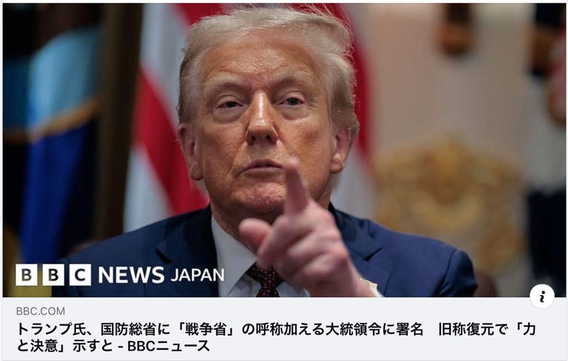 「『戦争省(Department of War)』という名称は、防衛力しか強調しない『国防総省(Department of Defense)』よりも、備えと決意のほどをより強力に伝える」TACO9月6日大統領令 「我々は守るだけでなく、攻めに出る。手ぬるい合法性ではなく、最大の殺傷力をもって。政治的な正しさではなく、暴力的な効果を目指す」、「我々は防衛者だけでなく、戦士を育てる」性的暴行で捜査された「醜聞」の元FOXニュース司会者ヘグセス 「4.すべての加盟国は、その国際関係において、武力による威嚇又は武力の行使を、いかなる国の領土保全又は政治的独立に対するものも、また、国際連合の目的と両立しない他のいかなる方法によるものも慎まなければならない」国連憲章 第2条 →唯一の例外は、憲章51条が定める個別的または集団的自衛権のみ。 「シカゴはなぜ『戦争省』と呼ばれるのかを知ることになる」「朝の強制送還のにおいが大好きだ」TACO6日 →1979年の映画『地獄の黙示録』を模した人工知能(AI)生成画像と映画のセリフ「朝のナパームの匂いは格別だ」を剽窃したもの 「米国大統領が、米国の都市に戦争を仕掛けると脅している。これは冗談ではない。正常ではない」「ドナルド・トランプは強者ではなく、おびえている。イリノイ州が独裁者気取りの人物におじけづくことはない」イリノイ州J.B.プリツカー知事 ・1968年秋、ドナルド・J・トランプはかかとの骨棘(こつきん)の診断を受け、ベトナム戦争中の兵役免除に至る。足病医のラリー・ブラウンスタイン博士は2007年に亡くなる。しかし、娘たちは、父がベトナム戦争中に幼いトランプを助けたという話をよく話していたと語る。 ・2020年9月3日米誌アトランティックは、トランプが戦死した米兵を「負け犬」や「まぬけ」と呼び、なぜ国のために命を落とすのか意味が分からないなどと発言を重ねていたと、複数の政権関係者の話として伝えた。 ・2024年、前政権時にトランプの首席補佐官を最も長く務めたジョン・ケリー海兵隊大将は、10月22日付の米紙ニューヨーク・タイムズにトランプが『「ファシスト」の定義に当てはまる。アドルフ・ヒトラーをたびたび称賛していた。戦死した米兵を「負け犬」と嘲笑していた』と答えている。 骨棘の詐病でベトナム戦争の徴兵を逃れ、戦死した米兵を「負け犬」「まぬけ」と嘲笑していた卑怯極まりない輩が、国連憲章が認める唯一の武力行使が「個別的あるいは集団的自衛権」だけであることも理解せず、第二次大戦後米国が正式に定めた「国防総省」の名を通称で「戦争省」と変え、映画を剽窃した司令官気取りのフェイク画像とともに、自国の都市への戦争で恫喝する、なんとも愚劣極まりない醜態。 これらの輩は、まとめてその役職から追放することが、米国そして世界の安定のための唯一の道。 《アメリカのドナルド・トランプ大統領は5日、国防総省の新名称に「戦争省」を使うよう指示する大統領令に署名した。国防総省はこの名称を副称として使用すること、またピート・ヘグセス国防長官は「戦争長官」を名乗るよう指示した。 アメリカ軍を統括する国防総省はもともと、1789年に閣僚級機関として設立され、1947年まで存在していた「戦争省」の後継機関に当たる。 トランプ氏がホワイトハウスで大統領令に署名すると、ヘグセス氏は「この名称変更は単に、名前を変えるためだけでなく、復元が目的だ」と述べ、「言葉は大事だ」と話した。 「我々は守るだけでなく、攻めに出る。手ぬるい合法性ではなく、最大の殺傷力をもって。政治的な正しさではなく、暴力的な効果を目指す」、「我々は防衛者だけでなく、戦士を育てる」と、ヘグセス氏は強調した。 ただし、行政府の省庁設置の権限は連邦議会にあるため、正式に名称を変更するには法改正が必要となる。 「備えと決意の強さを示す」ためと説明 大統領令には、「『戦争省(Department of War)』という名称は、防衛力しか強調しない『国防総省(Department of Defense)』よりも、備えと決意のほどをより強力に伝える」と書かれている。 また、「力と決意を示す」ため、国防長官およびその所属機関、下位の職員に対し、新名称を副称として使用することを認めている。 大統領令はヘグセス氏に対し、「戦争長官」を名乗り、省の正式な名称変更に向け、立法および行政措置を提案・実施するよう指示した。これは、トランプ大統領自身には、議会の承認なしに省の名称を正式に変更する権限がないため。 国防総省は5日夜、ウェブサイトのアドレスを「war.gov」に変更。名称も「米戦争省」に切り替えた。 「ピート・ヘグセス 戦争長官」と印字された名札が、木目の扉にかかっている画像提供,X/Pete Hegseth 画像説明,ヘグセス氏は「戦争長官(Secretary of War)」と書かれた名札を自分の執務室の扉に掲げ、その写真をソーシャルメディアに投稿した もともとの「戦争省」はジョージ・ワシントン初代大統領によって設立されたが、第2次世界大戦後に「国防総省」に改称された